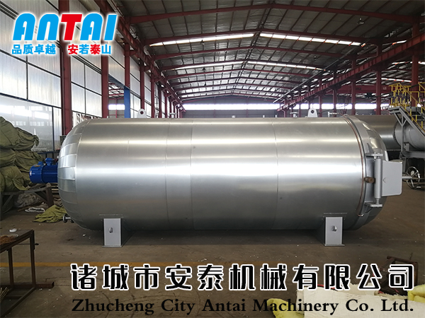 蒸汽由罐底進(jìn)入,在罐底設(shè)置蒸汽進(jìn)口由自動閥門控制,蒸汽擴(kuò)散管豎向在罐底排列,擴(kuò)散管中小口(3mm、4mm、5mm)按一定規(guī)則和角度彌補(bǔ)排列,確保蒸汽進(jìn)入到罐內(nèi)后溫度均勻向四周擴(kuò)散,防止蒸汽擴(kuò)散不均造成的產(chǎn)品質(zhì)量不同。設(shè)定工作程序后,控制系統(tǒng)自動進(jìn)行升溫、保溫、硫化等工作,硫化結(jié)束后發(fā)出聲光提示并停止工作。